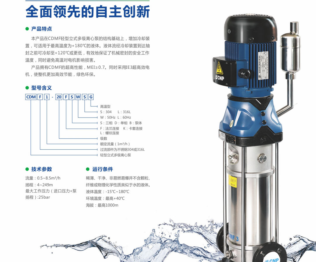 本產(chǎn)品在CDMF輕型立式多級(jí)離心泵的結(jié)構(gòu)基礎(chǔ)上,增加了冷卻裝置,適用于最高溫度為+180℃的液體。液體流經(jīng)冷卻裝置到達(dá)機(jī)封腔處可冷卻至+120℃或更低,有效保證機(jī)械密封的安全工作溫度,同時(shí)避免高溫對(duì)電機(jī)的損害影響。